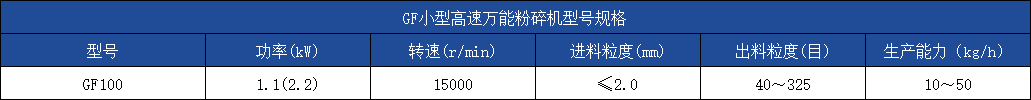 GF小型万能粉碎机的粉碎动盘由高速电机直接带动作高速转动,每分钟可达15000转。粉碎动盘和静盘有齿型、涡轮型、锤体型、销棒型等多种形式,可根据物料特性选择和调换。本机采用不锈钢材料制造,具有较强的耐磨耐腐蚀性能,适用于多品种小批量的各类物料的粉碎之用。